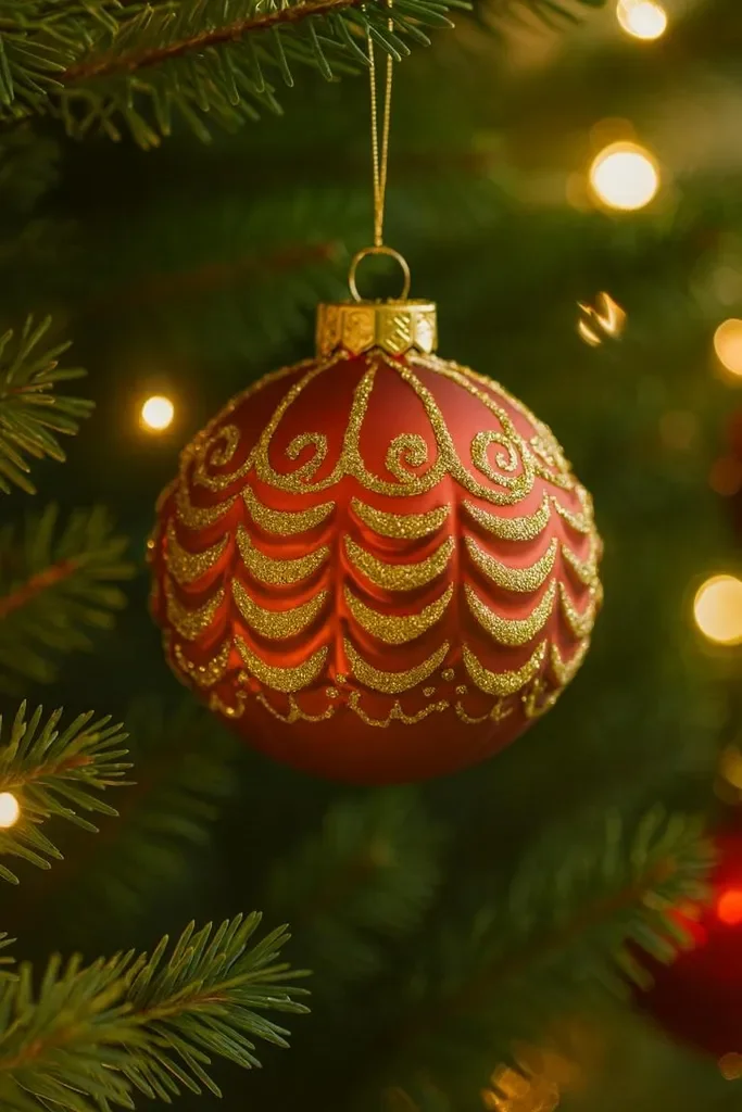 Diese hochwertige Christbaumkugel aus Glas beeindruckt mit ihrer intensiv roten Farbgebung und einem kunstvollen, wellenförmigen Goldglitter-Design. Die klassische Kombination aus Rot und Gold sorgt für einen eleganten, warmen Festtagscharme und lässt die Kugel sowohl in traditionellen als auch modernen Weihnachtsarrangements erstrahlen.