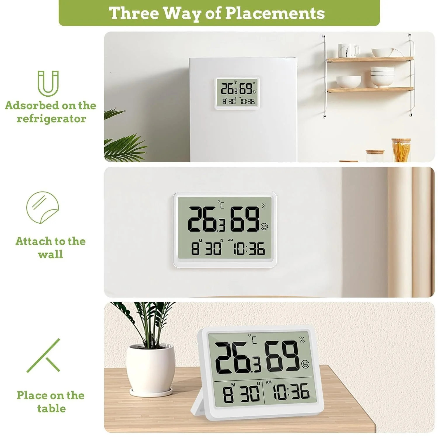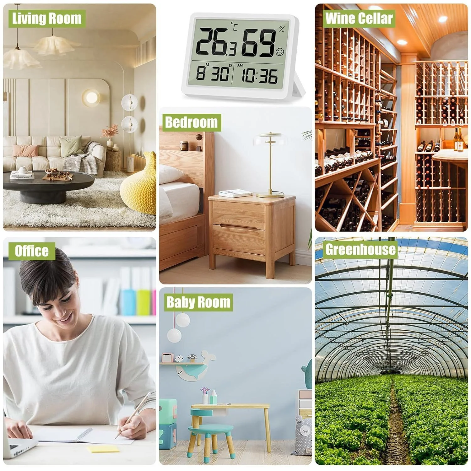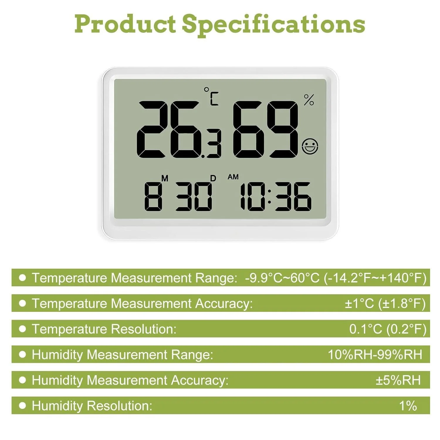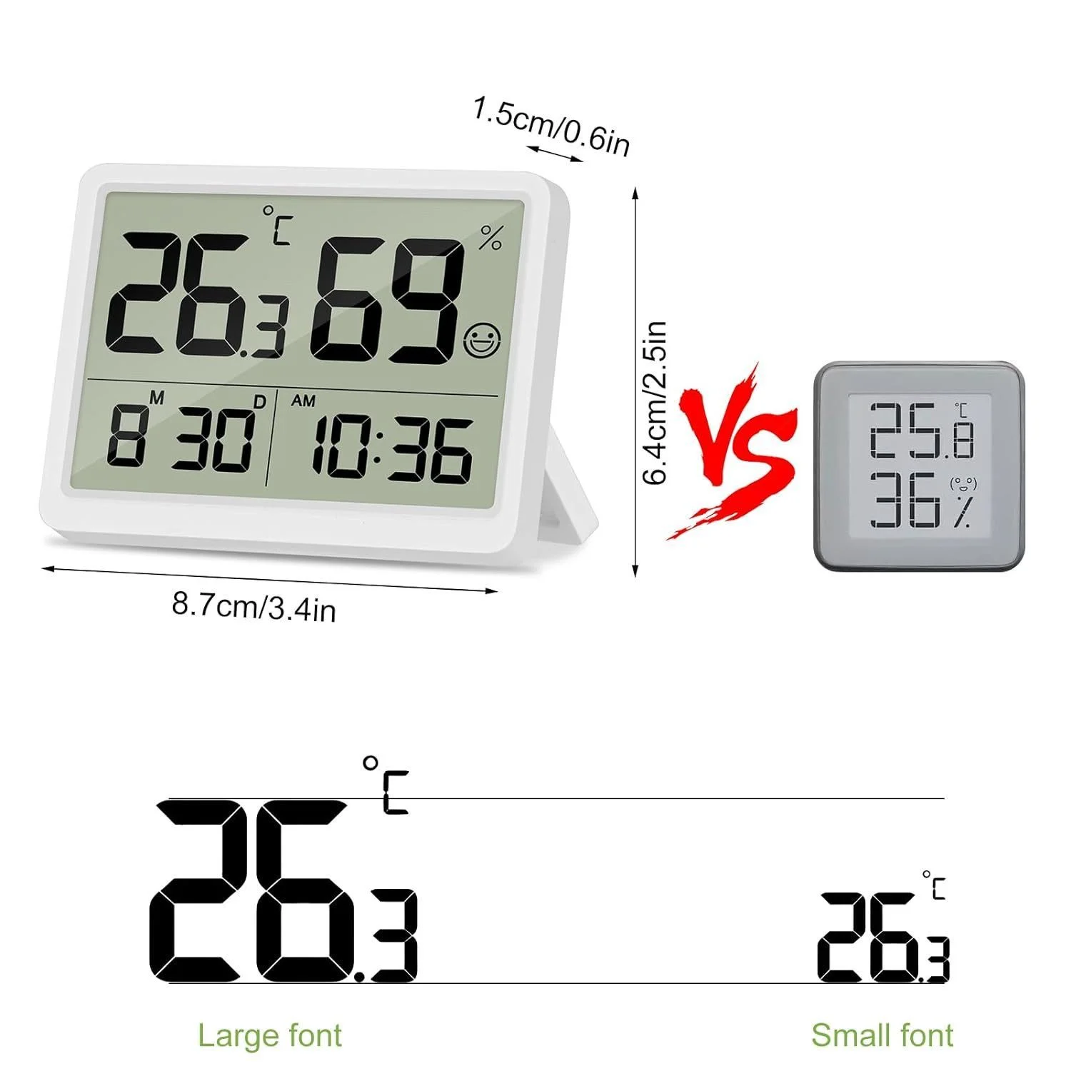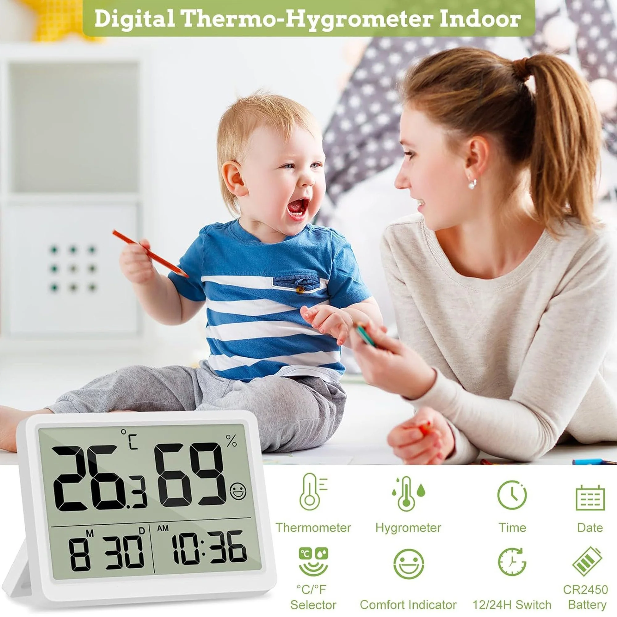 Dieses digitale Thermo-Hygrometer misst zuverlässig die Temperatur und Luftfeuchtigkeit in Innenräumen und aktualisiert die Werte alle 10 Sekunden. Die große LCD-Anzeige zeigt Temperatur, Luftfeuchtigkeit sowie Uhrzeit, Datum und Monat gut lesbar an. Ideal für Wohnzimmer, Schlafzimmer, Kinder- und Babyzimmer, Büros und vieles mehr.