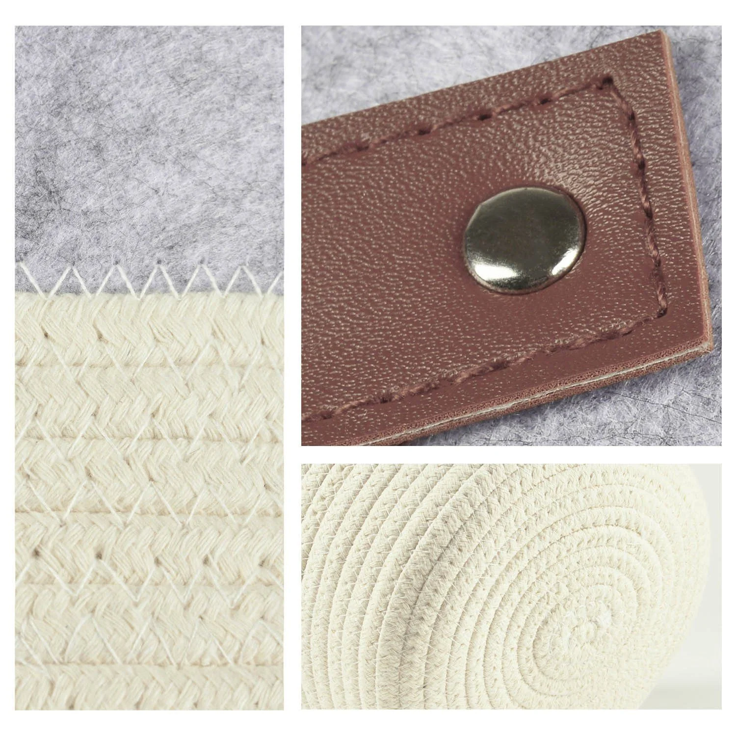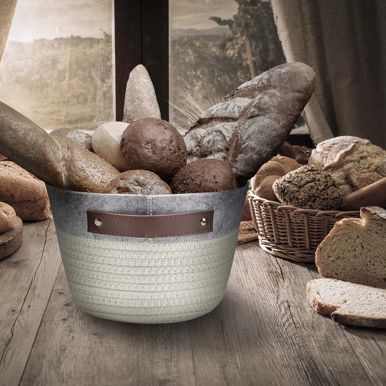 Vielseitiger Organisationskorb aus Leinen, Bast und Filz mit Ledergriffen