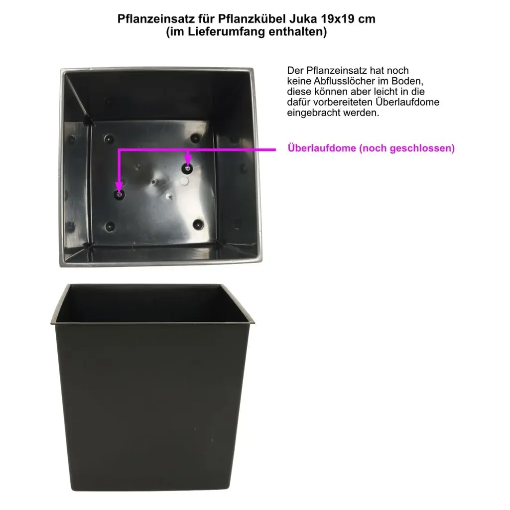 Für direkte Bepflanzung im Einsatz müssen vorbereitete Entwässerungslöcher geöffnet werden. Optionaler Bewässerungseinsatz nur für größere Modelle geeignet (nicht für 19 cm). |