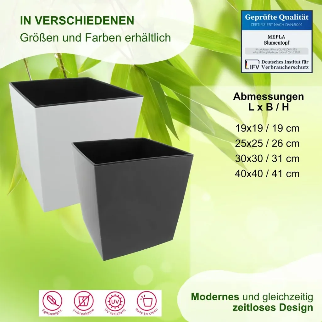 Der Topf besteht aus hochwertigem Polypropylen – einem leichten, robusten und UV-beständigen Material, das sich durch hohe Haltbarkeit und Witterungsresistenz auszeichnet. Ideal für den Innen- wie Außenbereich und perfekt für moderne, minimalistische Wohn- und Gartenkonzepte.