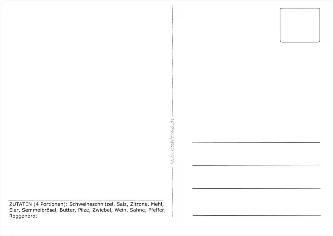 - Zutaten (4 Portionen): Schweineschnitzel, Salz, Zitrone, Mehl, Eier, Semmelbrösel, Butter, Pilze, Zwiebel, Wein, Sahne, Pfeffer, Roggenbrot