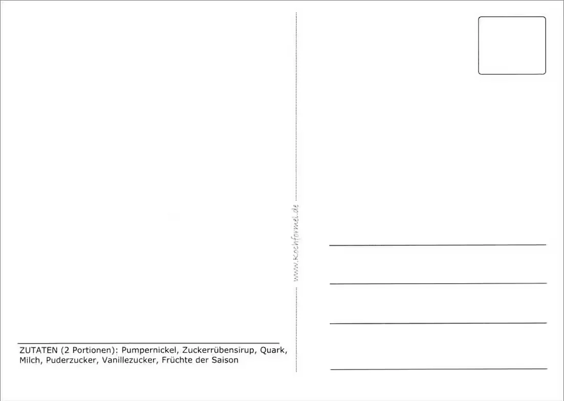 - Zutaten für 2 Portionen: Pumpernickel, Zuckerrübensirup, Quark, Milch, Puderzucker, Vanillezucker, Früchte der Saison