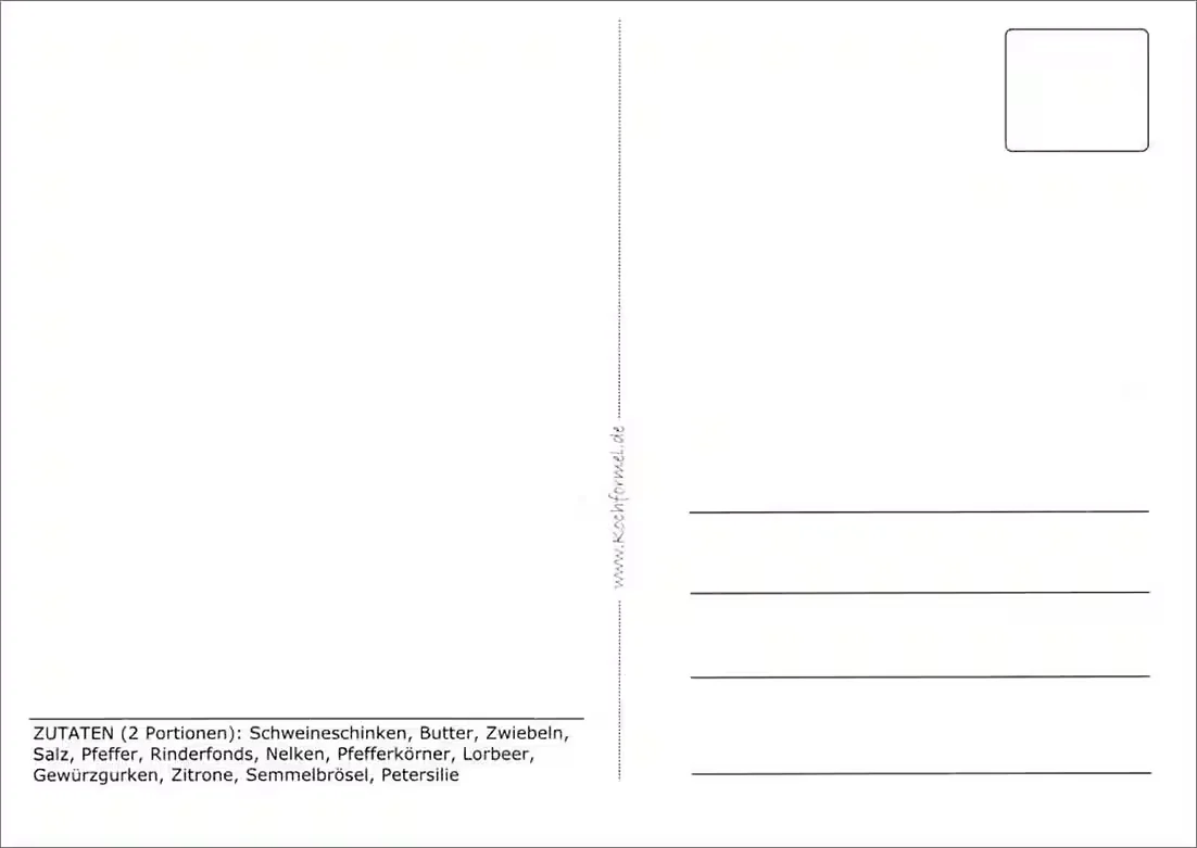 - Zutaten für 2 Portionen: Schweineschinken, Butter, Zwiebeln, Salz, Pfeffer, Rinderfonds, Nelken, Pfefferkörner, Lorbeer, Gewürzgurken, Zitrone, Semmelbrösel, Petersilie