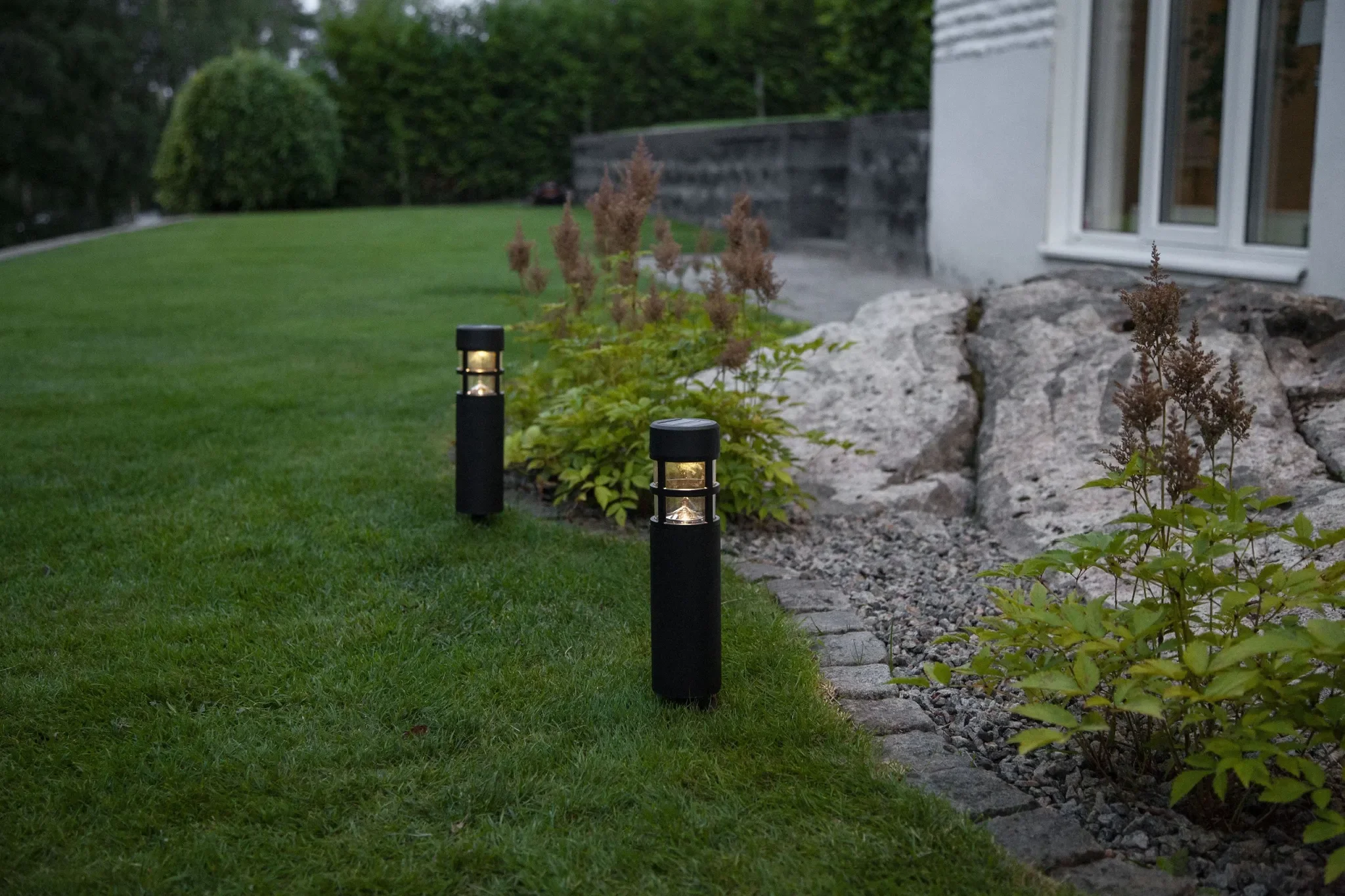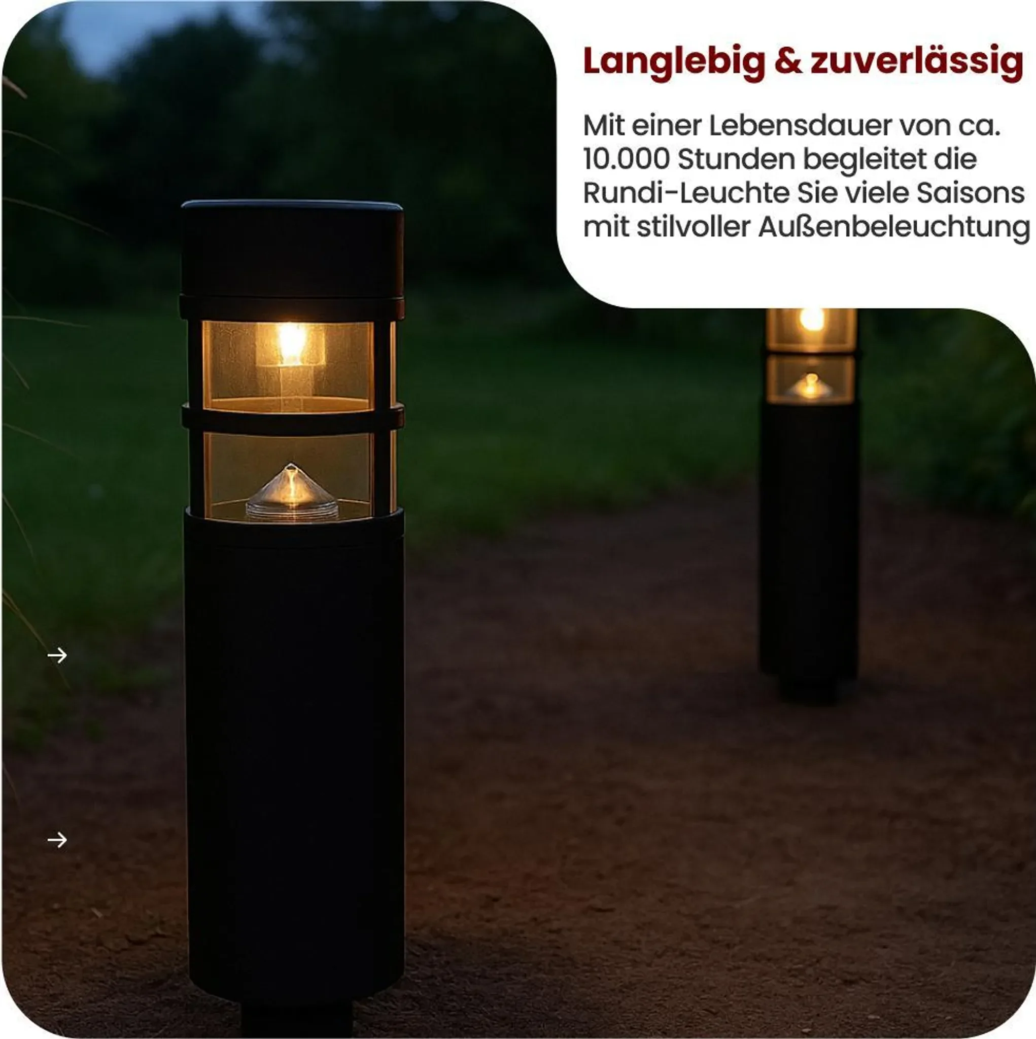2 × LED-Solar-Wegeleuchte „Rundi“ 2 × AAA NiMH-Akkus (inkl.) Erdspieße für einfache Platzierung |