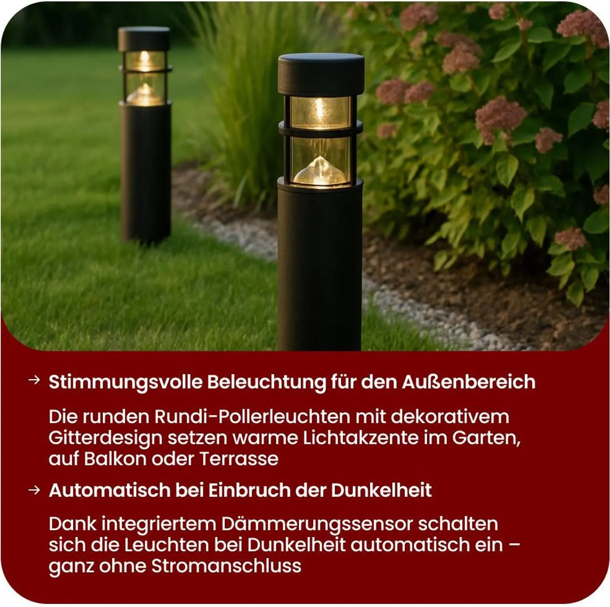 Warmweißes Licht • Mit Erdspieß • Automatischer Dämmerungssensor • Outdoor-geeignet (IP44)