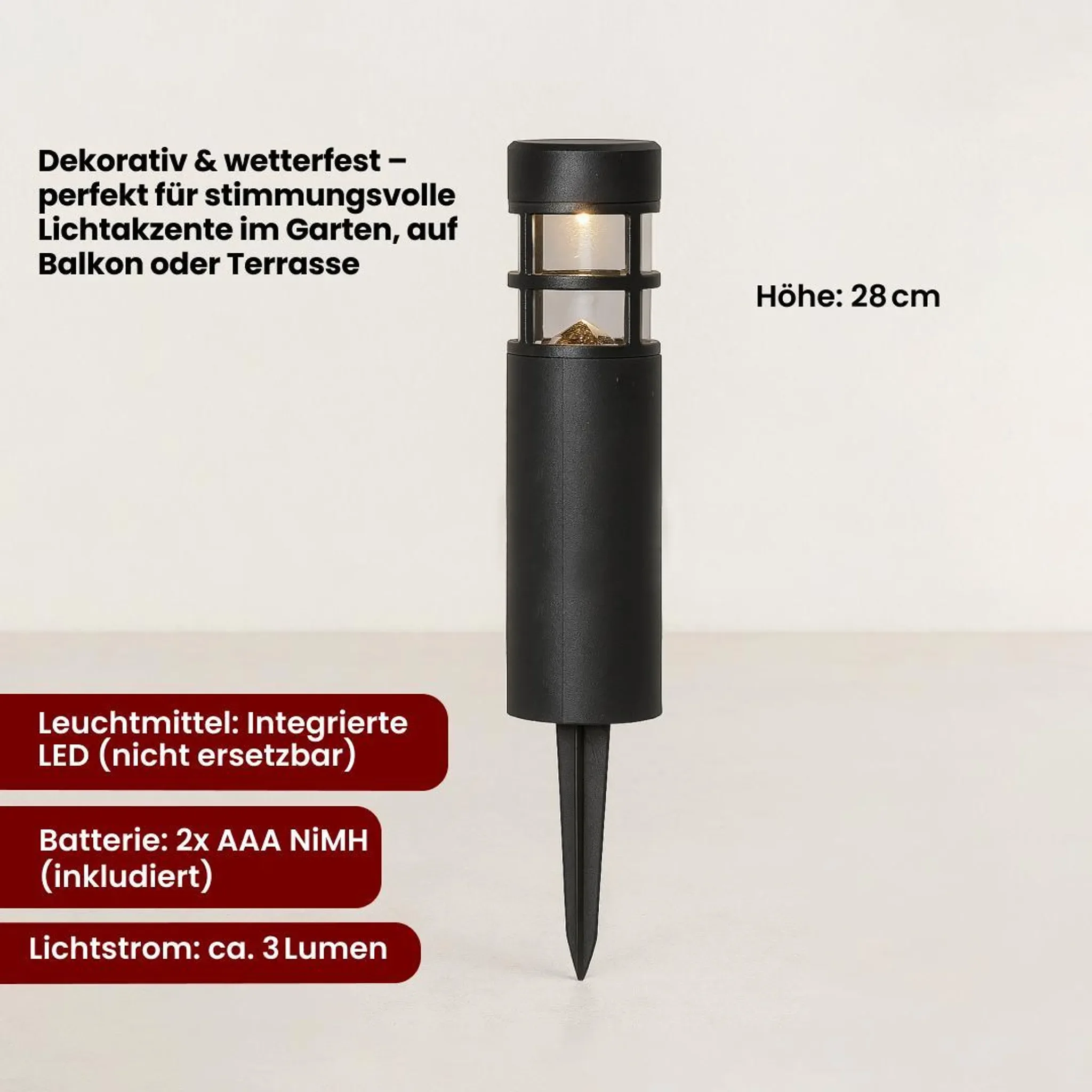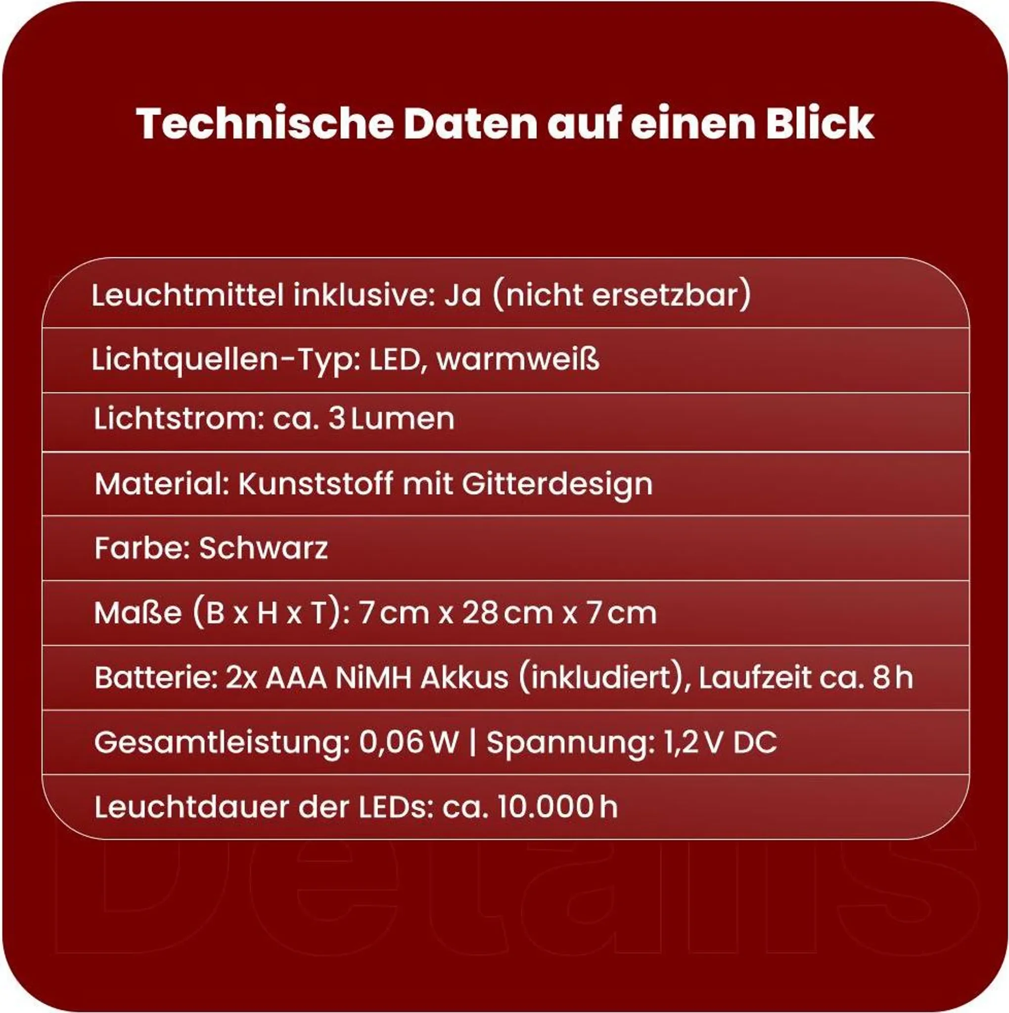 | Energiequelle | Solar + Akku (AAA NiMH, inkl.), Laufzeit ca. 8 h |