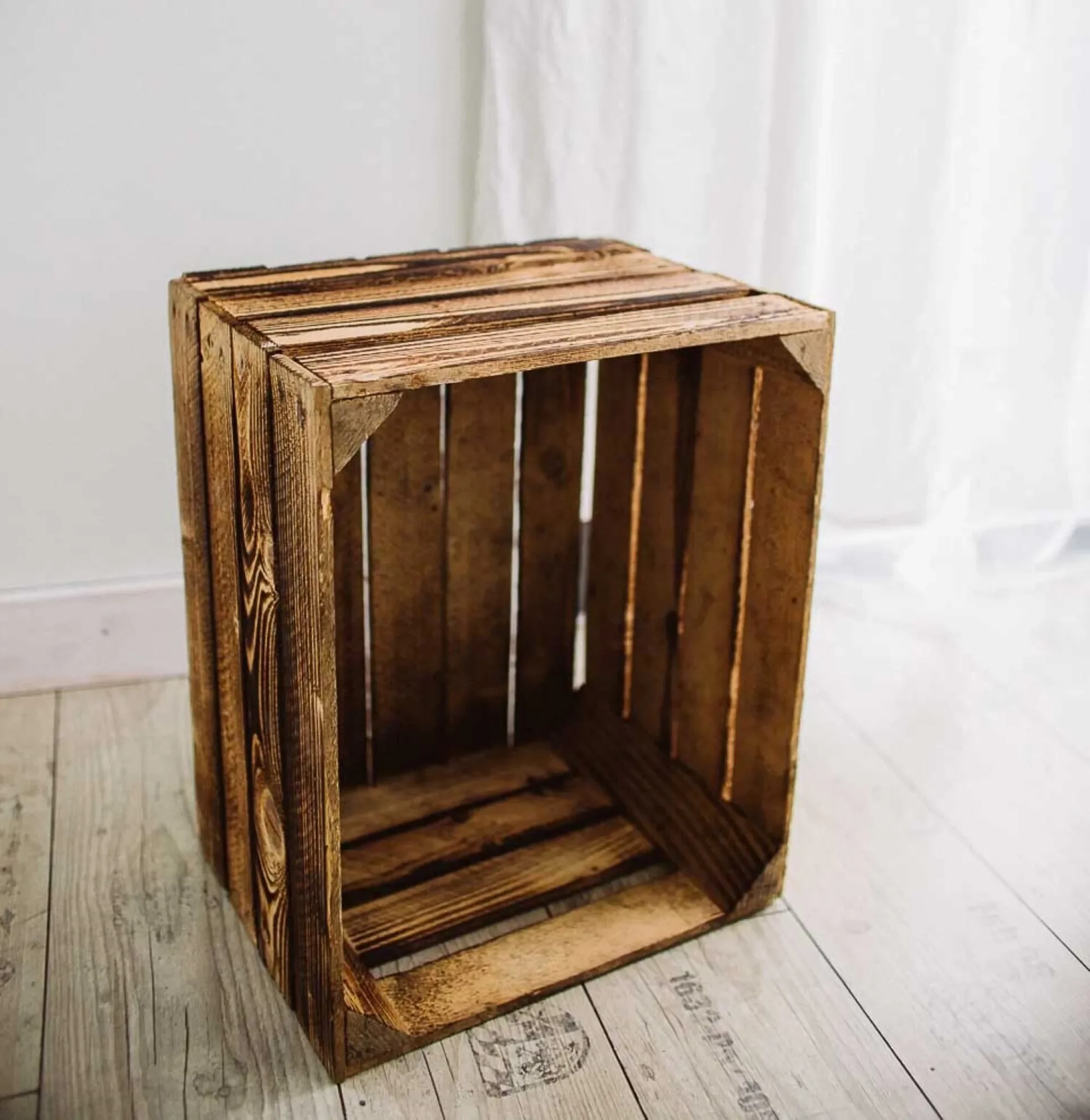 Ob als Bücherregal, Pflanzenständer, Couchtisch, Küchenaufbewahrung oder als Teil eines selbstgestalteten Regalsystems – jede Kiste ist ein Unikat mit rustikaler Flammoptik und sorgt für ein gemütliches Wohnambiente im Shabby-Chic- oder Landhausstil.
