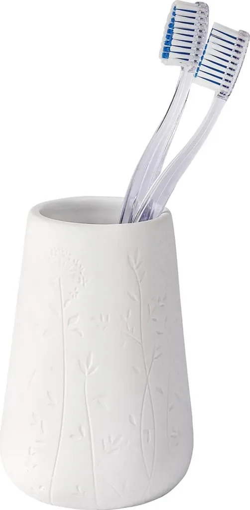Der WENKO Zahnputzbecher Flora kombiniert Funktionalität und Design. Hergestellt aus hochwertiger Keramik, besticht der Becher durch seine elegante weiße Farbgebung und ein zartes Blümchen-Relief. Ideal zur Aufbewahrung von Zahnbürsten, Zahnpasta oder kleinen Badezimmeraccessoires.